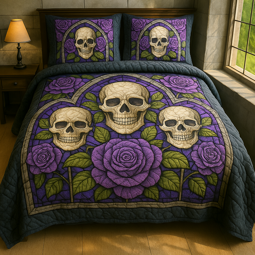 Marivn® Gothic Stained-Glass Skull & Purple Rose 3-Piece Quilted Bedding Set