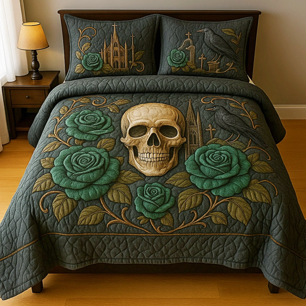 Marivn® Gothic Skull & Teal Emerald Rose 3-Piece Quilted Bedding Set