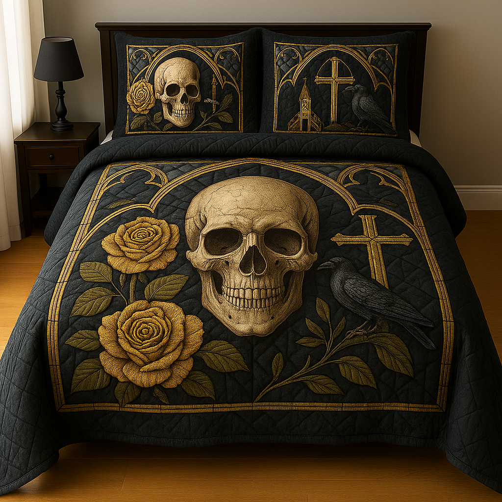 Marivn® Gothic Golden Skull & Raven 3-Piece Quilted Bedding Set