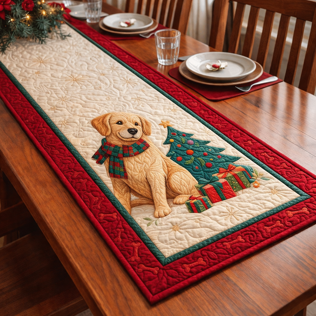 Christmas Puppy Quilted Table Runner – Holiday Dog & Tree Design