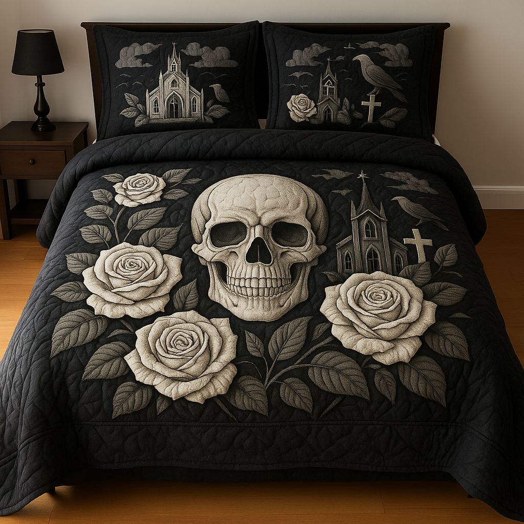 Marivn® Gothic White Rose & Skull Cathedral 3-Piece Quilted Bedding Set