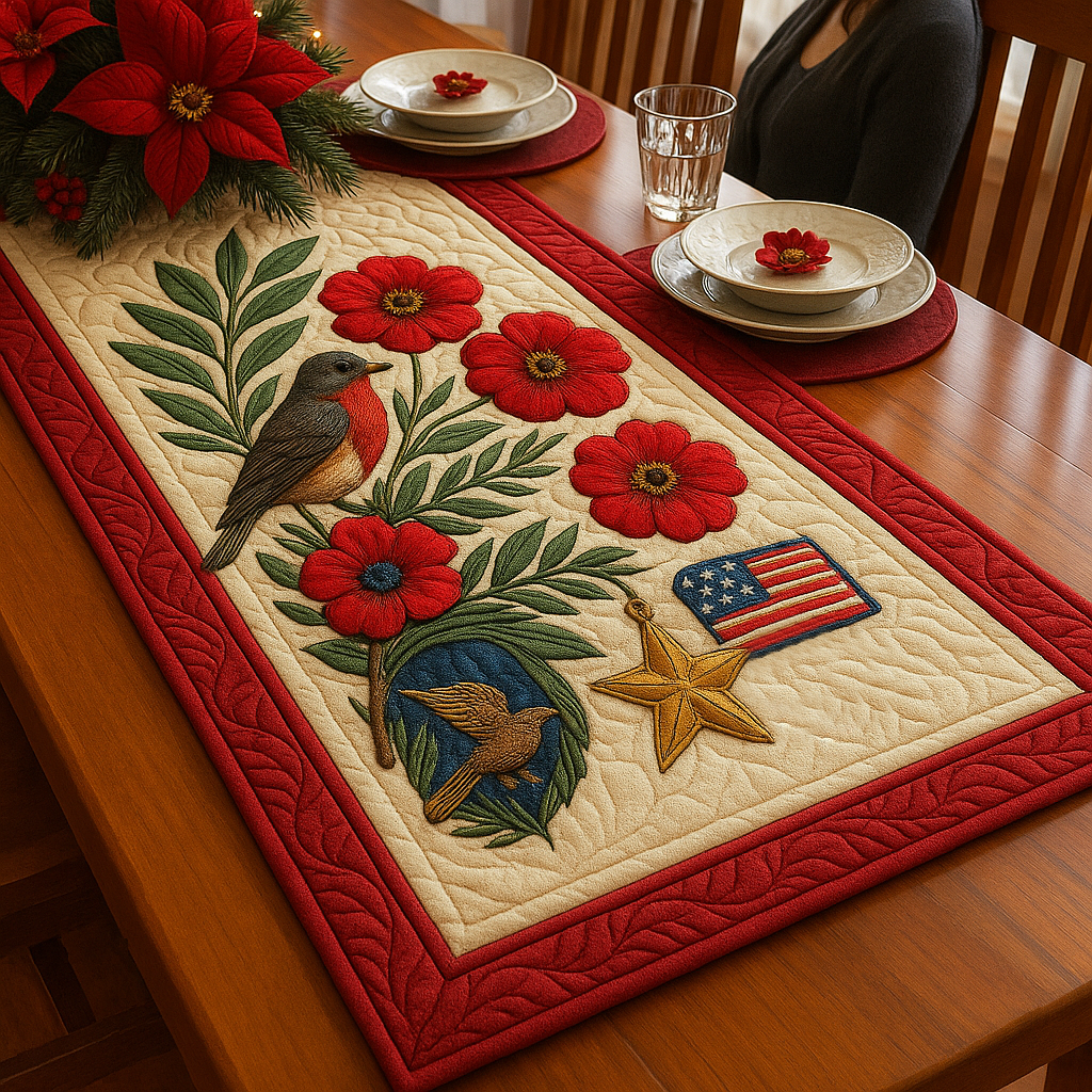 Patriotic Songbird Quilted Table Runner – A Gentle Tribute at Every Meal 🇺🇸🌸